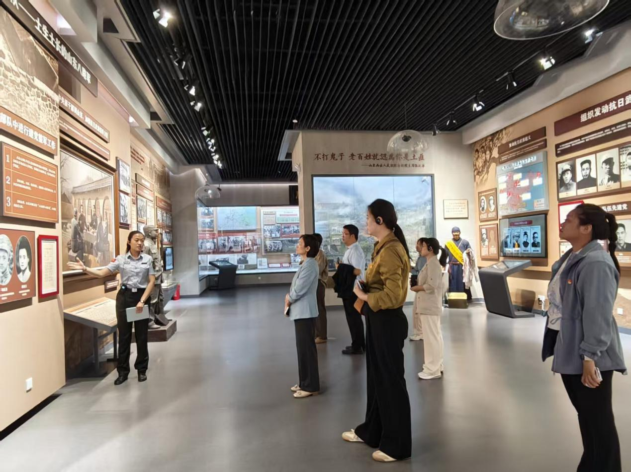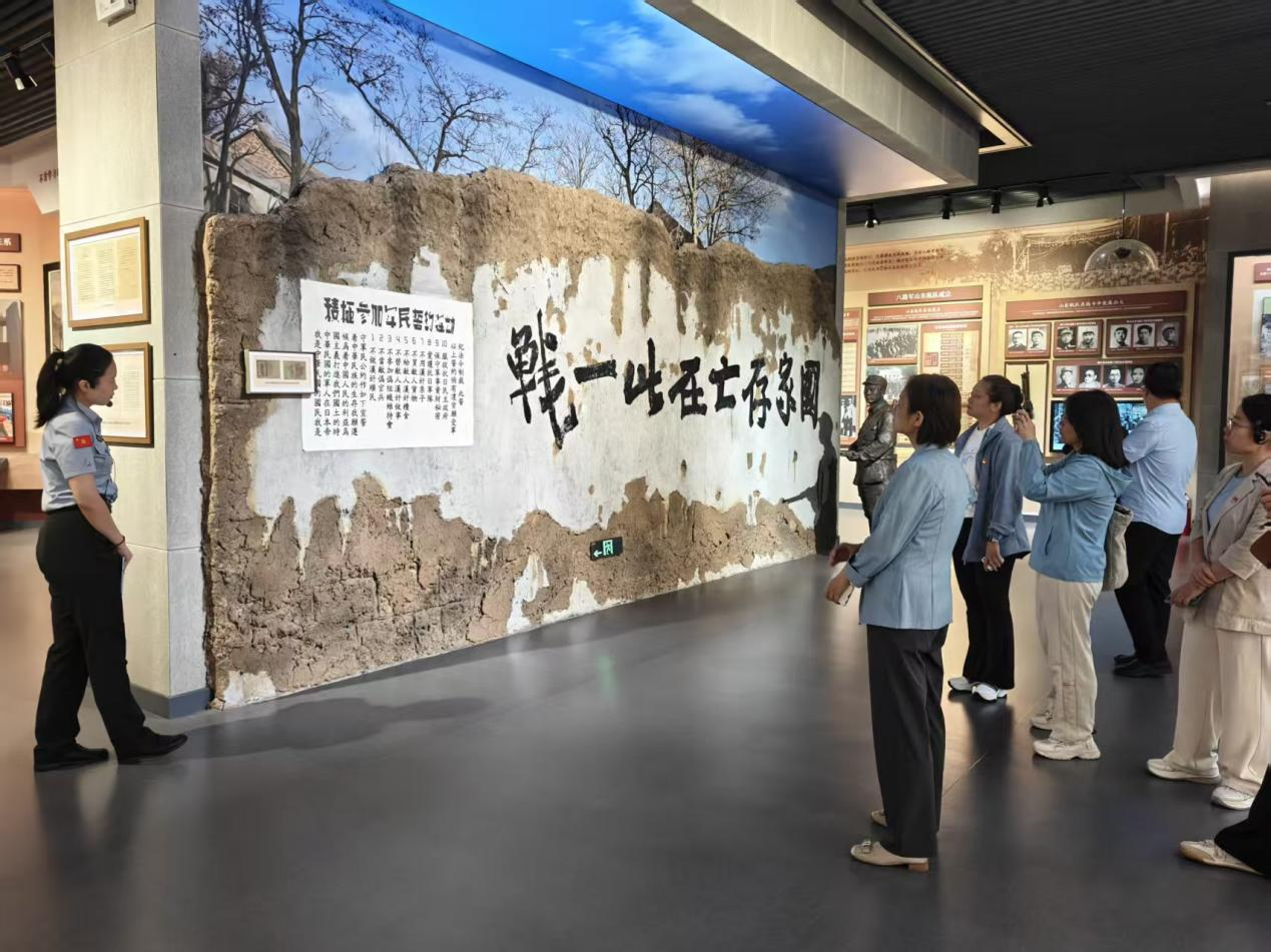 在老战士纪念广场陈列馆,大家在讲解员的带领下,依次参观了“齐鲁御寇血铸长城”“向北发展向南防御”“雄狮百万转战全国”“北上南下开辟新区”“保家卫国不辱使命”“集体转业再立新功”“沙海女兵戈壁母亲”7个展区和“山东抗日民主政权”专题展览,重温了从抗日战争、解放战争到抗美援朝,山东子弟兵为民族解放、家国安宁而血战沙场的英勇事迹;聆听了为新中国建立而英勇奋战的山东籍老战士的革命故事;了解了山东英雄部队从抗日战争至中华人民共和国成立初期作出的巨大牺牲,深刻感受到了山东老战士们“忠诚英勇、血性刚正、坚韧耐劳、遵纪爱民”的革命英雄主义精神。